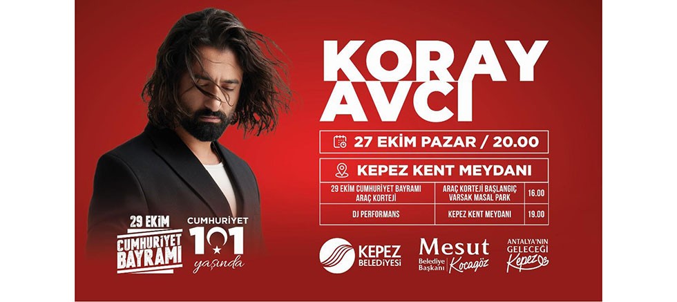Kepez Belediyesi’nin düzenlediği Cumhuriyet Bayramı etkinlikleri kapsamında ünlü sanatçı Koray Avcı, 27 Ekim Pazar günü saat 20.00’da, Kepez Kent Meydanı’nda sahne alacak.