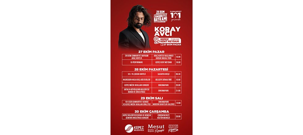Cumhuriyet’in kuruluşunun 101. Yıl kutlamaları, Kepez’de birbirinden güzel etkinliklerle coşkuyla gerçekleştirilecek. Kepez Belediyesi, Cumhuriyet Bayramı etkinlikleri kapsamında 27 Ekim Pazar günü saat 16.00’da kortej düzenleyecek. Varsak Masal Park önünden başlayacak kortej, Kepez Kent Meydanı’nda sona erecek. Kepez Kent Meydanı’nda toplanacak Antalyalılar, burada saat 19.00’da gerçekleştirilecek DJ performansı ile Cumhuriyet coşkusunu doyasıya yaşayacak. Kepez’de, 27 Ekim Pazar günü başlayacak Cumhuriyet Bayramı coşkusu, Kepez’de saat 20.00’da ünlü sanatçı Koray Avcı konseriyle devam edecek. 28 Ekim Pazartesi günü saat 09.30’da ‘101.Yıl Çocuk Korteji’ düzenlenecek. Minikler bayram coşkusunu doyasıya yaşayacak. Nasreddin Hoca Kreş ve Gündüz Bakım Evleri öğrencileri, Kepez Belediyesi hizmet binası önünde Saat 10.00’da renkli bir gösteri sergileyecek. DokumaPark Yeşilçam alanında saat 20.00’da Kepez Müzik Okulları, saat 21.00’da Antalya Büyükşehir Belediyesi Bando ve Orkestrası konser verecek. Kepez Belediyesi’nin Cumhuriyet Bayramı etkinlikleri kapsamında 29 Ekim Salı günü saat 13.00’da Modern Sanatlar Galerisi’nde, ‘101. Yıla Özel 101 Eser Cumhuriyet Sergisi’ sanatseverler beraber açılacak. 30 Ekim Çarşamba günü saat 20.00’da Kepez Belediyesi Çocuk ve Gençlik Senfoni Orkestrası Konseri, Erdem Bayazıt Kültür Merkezi’nde gerçekleştirilecek.