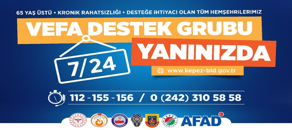 İçişleri Bakanlığı tarafından 65 yaş ve üstü ile kronik rahatsızlığı olanlara “Sokağa çıkma sınırlaması” getirilince, yayınlanan genelge doğrultusunda 81 ilde ‘Vefa Sosyal Destek Grubu’ oluşturuldu. Valilikler bünyesinde, İl Emniyet Müdürlüğü, jandarma, AFAD, Kızılay ve yerel yönetimler den oluşturulan Vefa Sosyal Destek Grubu, 65 yaş ve üstü, kronik rahatsızlığı olan vatandaşların ihtiyaçlarının giderilmesini koordineli bir şekilde üstlenecek. Kepez Belediyesi de ilçede bulunan 65 yaş ve üstü, kronik rahatsızlığı olan vatandaşların mağdur olmaması için gerekli önlemleri aldı.