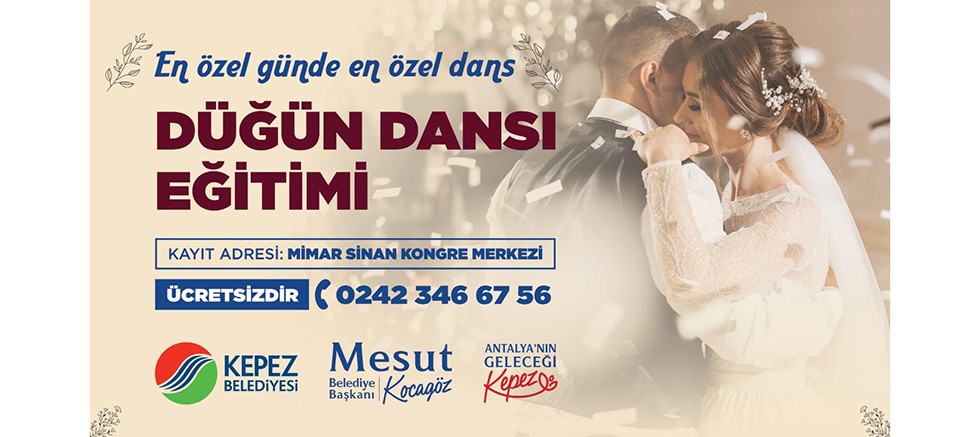 En özel gününü muhteşem bir düğün dansı ile taçlandırmak isteyen çiftlere Kepez Belediyesi’nden destek geldi. Kepez Belediyesi, dünya evine girecek olan çiftlere özel ‘Düğün Dansı Eğitimi’ kursu açıyor. İlk danslarını en göz kamaştırıcı şekilde yapmanın yolunu arayan çiftler en mutlu günlerine Kepez’de, profesyonel dans eğitmenleri ile hazırlanacak. Kepez Belediyesi’nin evlenecek çiftlere ücretsiz olarak sunacağı Düğün Dansı Eğitimi’nde, seçilen parçanın ritmine uygun dansın temel adımları ve ardından da seviye figür ve dönüş eğitimleri verilecek.