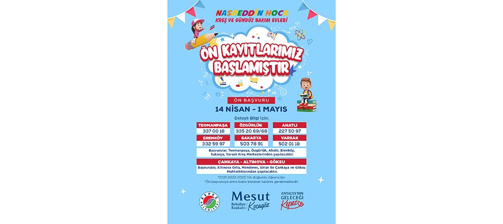 Kepez Belediyesi Nasreddin Hoca Kreş ve Gündüz Bakım Evleri’nin 14 Nisan'da başlayan ön kayıtları 1 Mayıs’ta sona erecek.