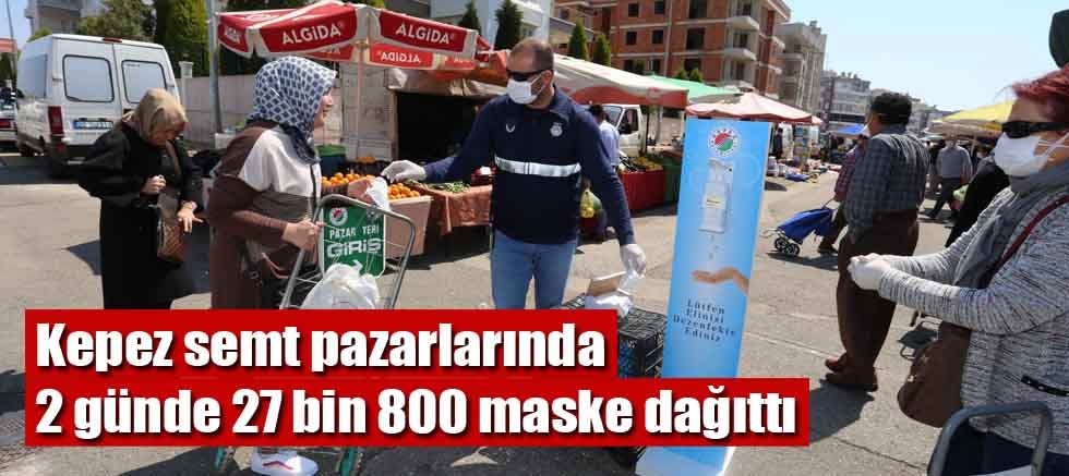 Koronavirüs (Covid -19) salgınını önlemek için birçok tedbir alan Kepez Belediyesi, bir yandan da vatandaşların alışverişlerini sağlıklı ve güvenli bir ortamda yapabilmesini sağlıyor. Kepez Belediyesi’nin virüse karşı önleyici tedbirler kapsamında Bilim Kurulu’nun kararlarına uygun olarak 5 Nisan 2020 tarihinden itibaren ilçedeki tüm semt pazarlarında başlattığı ücretsiz maske dağıtımı her gün aralıksız devam ediyor. Kepez Belediyesi, pazartesi günleri ilçede kurulan Çankaya, Ünsal, Yenidoğan ve Mehmet Akif Mahallelerindeki semt pazarlarında 1 günde toplam 8 bin 500 adet ücretsiz maske dağıttı. Salı günü kurulan Kanal, Şafak, Kütükçü, Kuzeyyaka, Emek, Varsak Karşıyaka, Zeytinlik Mahalleleri semt pazarlarında da 19 bin 300 adet ücretsiz maske dağıtımı yapan Kepez Belediyesi Zabıta Müdürlüğü ekipleri, 2 günde pazar alanlarında toplamda 27 bin 800 adet ücretsiz maske dağıtımı gerçekleştirdi.