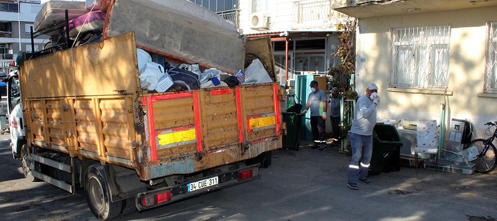 Temizlik İşleri Müdürlüğü ekipleri, zabıta ve polis gözetiminde evin çevresinde yaptığı tahliye ve temizlik çalışmasında çöpleri çıkararak, kamyona yükledi. Konuttan 3 kamyon dolusu atık çıkarıldı.