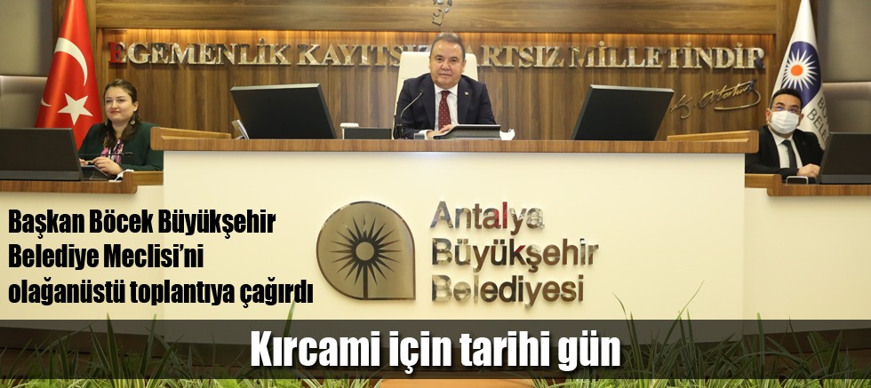 Antalya Büyükşehir Belediyesi 16 Şubat Çarşamba günü saat 14.00’te Kırcami başta olmak üzere Antalya’nın 100 binlik çevre düzeni planını karara bağlamak üzere toplanıyor. Meclisi olağanüstü toplantıya çağıran Başkan Muhittin Böcek, “Çarşamba günü tarihi bir gün olacak” dedi.