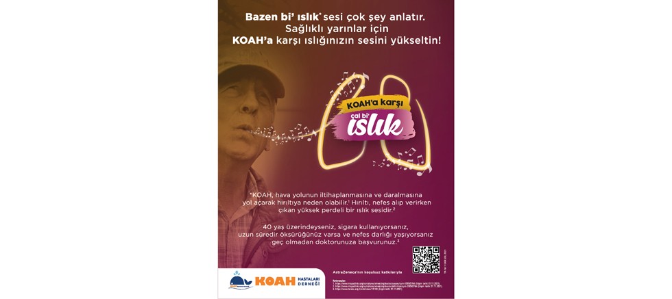 KOAH Türkiye’de en çok ölüme neden olan üçüncü hastalık konumunda. Nefes darlığı, öksürük ve balgam belirtileriyle kendini gösteren KOAH’ın ilerleyişi, erken tanı konulmasının yanı sıra tütün kullanımı gibi risk faktörlerinden uzaklaşmakla durdurulabiliyor. KOAH Hastaları Derneği, AstraZeneca’nın koşulsuz destekleriyle hayata geçirdiği “KOAH’a Karşı Çal Bi’ Islık” kampanyasıyla hastalığa yönelik farkındalığı artırmayı hedefliyor.