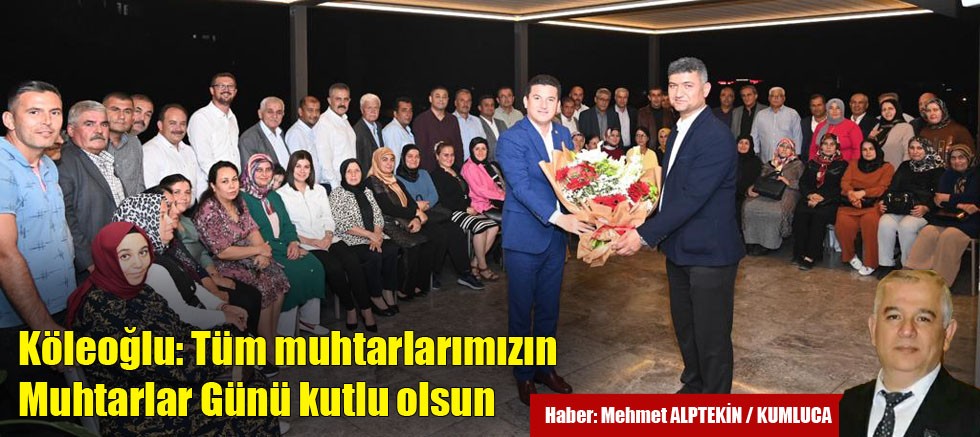 Kumluca Belediye Başkanı Mustafa Köleoğlu, Kumluca'da görev yapan Mahalle Muhtarlarıyla, bir restaurantta verilen akşam yemeğinde bir araya geldi. 19 Ekim Muhtarlar Günü dolayısıyla, kısa bir konuşma yapan Köleoğlu, Muhtarların gününü kutlayarak, tüm Mahalle Muhtarlarını temsilen, Muhtarlar Derneği Başkanı İbrahim Songur'a çiçek takdim etti.