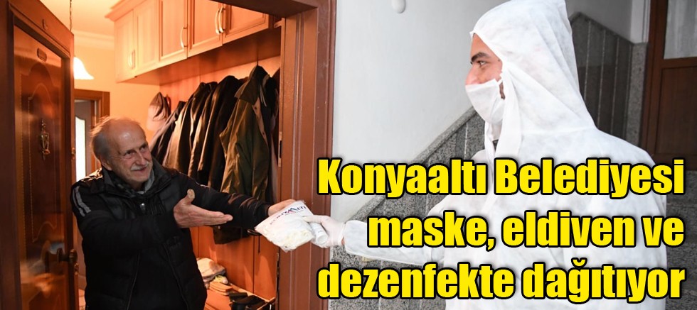 Konyaaltı Belediyesi ekipleri koronavirüs salgına karşı 7 gün 24 saat çalışmalarını sürdürüyor. Konyaaltı Belediyesi ve Konyaaltı Kaymakamlığı ile koordineli bir şekilde yürütülen çalışmalar kapsamında 65 yaş üstü vatandaşlara, kronik rahatsızlığı olan ve evde yalnız yaşayan vatandaşların ihtiyaçlarına karşılamaya devam ediyor. Konyaaltı Belediye Başkanı Semih Esen, vatandaşlara evde kalmaları çağrısını yinelerken, talepte bulanan vatandaşların maske, eldiven ve dezenfekte ihtiyaçlarını karşılayacaklarını açıkladı. Konyaaltı Belediyesi ekipleri de hemen harekete geçerek, ihtiyacı olan vatandaşların evlerine maske, eldiven dağıtımı gerçekleştiriyor.