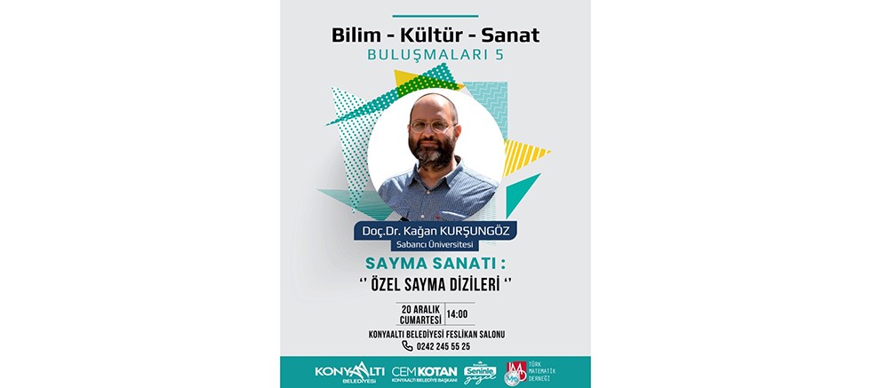 Konyaaltı Belediyesi, Bilim-Kültür-Sanat Buluşmaları’nın beşincisini düzenleyeceğini duyurdu. Konyaaltı Belediyesi Kültür, Sanat ve Sosyal İşler Müdürlüğü’nden edinilen bilgiye göre buluşmanın, ‘Sayma Sanatı: Özel Sayma Dizileri’ konusu altında düzenleneceği aktarıldı. Türk Matematik Derneği ile iş birliği içerisinde Sabancı Üniversitesi Mühendislik ve Doğa Bilimleri Fakültesi Öğretim Üyesi Doç. Dr. Kağan Kurşungöz’ün sunumuyla gerçekleşecek 5’inci Bilim-Kültür-Sanat Buluşması, 20 Aralık Cumartesi günü saat 14.00’te Konyaaltı Belediyesi Ana Hizmet Binası içerisinde bulunan Feslikan Salonu’nda düzenlenecek. Vatandaşlar herhangi bir ücret ödemeden etkinliğe katılabilecek.