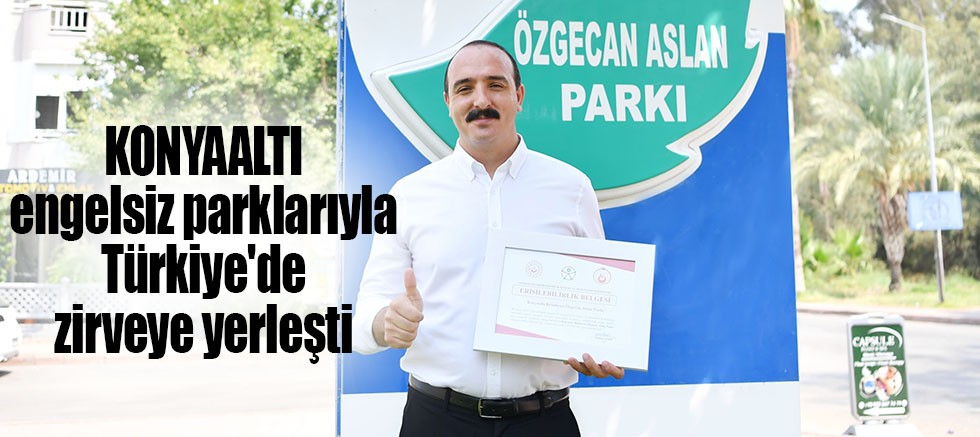 Konyaaltı ilçesinde engellilere yönelik erişilebilir park sayısı 14’e yükseldi. Konyaaltı, Türkiye’de engellilere yönelik erişilebilir park sayısı bakımından zirveye yerleşti. Erişilebilirlik Belgesini Antalya Valisi Hulusi Şahin’den alan Konyaaltı Belediye Başkanı Cem Kotan, “Türkiye’ye örnek olduğumuz için çok gururluyuz” dedi.