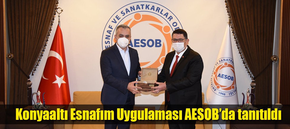 Konyaaltı Belediye Başkanı Av. Semih Esen, Antalya Esnaf ve Sanatkarlar Odaları Birliği’ni ziyaret ederek AESOB Başkanı Adlıhan Dere, Birlik Yönetim, Denetim ve Disiplin Kurulu Üyelerine Konyaaltı’ndaki esnaf ve sanatkarların mahallesindeki hanelere hizmet ve satış yapabileceği, esnafların sipariş siteleri üzerinden ödedikleri yüksek komisyonlardan kurtulmasının amaçlandığı "Konyaaltı Esnafım" uygulaması ile ilgili bilgi aktardı.