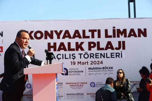 Antalya Büyükşehir Belediyesi’nin kendi öz kaynaklarıyla yapımına başladığı Boğaçayı Köprüsü ile Liman arasında kalan 1 kilometre uzunluğundaki Konyaaltı Liman Halk Plajı projesi tamamlandı. Projenin açılış törenine Antalya Büyükşehir Belediye Başkanı Muhittin Böcek, Cumhuriyet Halk Partisi (CHP) Grup Başkanvekili Ali Mahir Başarır, CHP Antalya İl Başkanı Nail Kamacı, Milletvekilleri Sururi Çorabatır, Cavit Arı, Aliye Coşar, Mustafa Erdem ve CHP Konyaaltı Belediye Başkan Adayı Cem Kotan ve çok sayıda vatandaş katıldı.