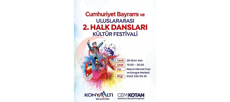 Konyaaltı Belediyesi, Cumhuriyetin kuruluşunun 102’nci yıl dönümü kutlamaları kapsamında ‘Cumhuriyet Bayramı ve Uluslararası 2. Halk Dansları Kültür Festivali’ düzenleneceğini duyurdu. Kutlama programı 28 Ekim Salı günü, Nazım Hikmet Fuar ve Kongre Merkezi’nde gerçekleşecek.