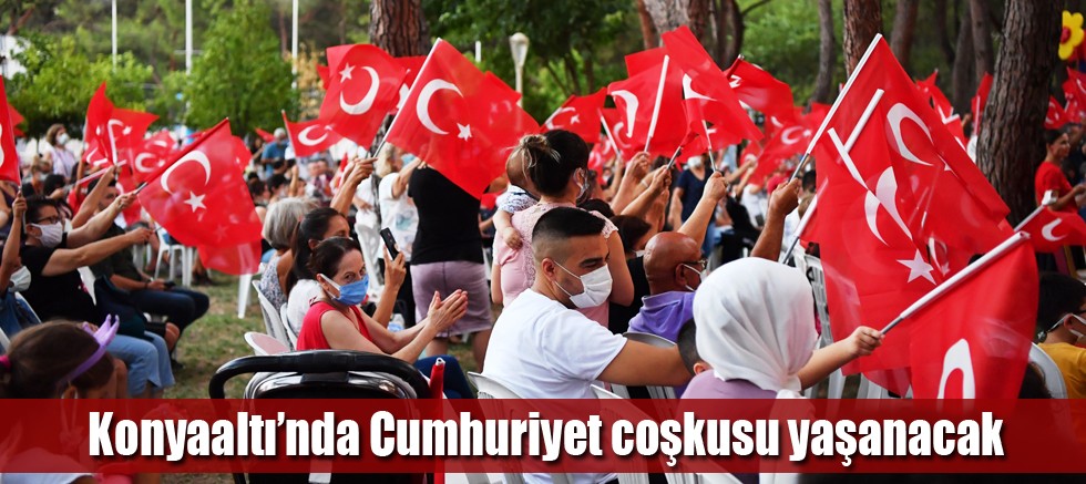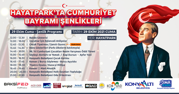 Cumhuriyet’in 98’inci kuruluş yıl dönümü Konyaaltı’nda coşkuyla kutlanacak. Konyaaltı Belediyesi, Mustafa Kemal Atatürk’ün Türk Milleti’ne armağan ettiği Cumhuriyet için çok özel etkinlikler hazırladı. ‘HayatPark’ta Cumhuriyet Bayramı Şenlikleri’ kapsamındaki etkinlikler, 29 Ekim Cuma günü saat 12:00’de bando gösterisi ile başlayacak. Akşam 22:00’ye kadar sürecek etkinliklerde sırasıyla çocuk tiyatrosu, farklı ülkelerin katılacağı dans gösterileri, 98. Yıl Cumhuriyet Çocukları Resim Yarışması ödül töreni, Atatürk ve yemek söyleşisi, çocuk korosu, Burcu Ayyıldız-Burcu Söylemez konseri, Kuva-yi Milliye tiyatro oyunu, Mavi Akustik konseri, Konyaaltı Belediyesi Halk Oyunları Topluluğu ve Konyaaltı Belediyesi Oda Orkestrası sahne alacak. Saat 12:00 ile18:00 arasında da çocuklar için eğlenceli atölyeler yer alacak.