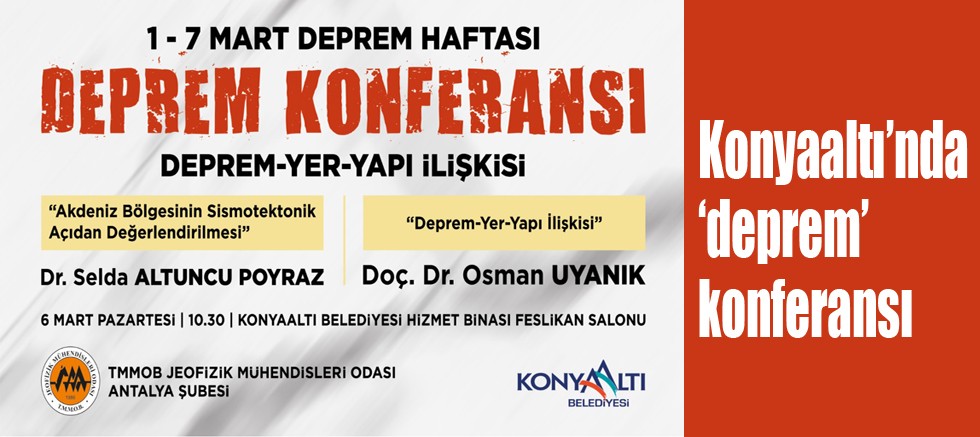 Deprem Haftası’nda her yıl 1-7 Mart tarihleri arasında düzenlenen çeşitli etkinliklerle toplumda depreme yönelik bilinçlenme ve farkındalığın oluşması amaçlanıyor. Kahramanmaraş merkezli meydana gelen iki büyük depremin ardından afetten önce ve sonra neler yapılması gerektiği daha da önem kazanırken, sivil savunmaya yönelik çalışmalar da hız kazandı. Bu nedenle depremle ilgili toplumsal bilinci artırmak için Konyaaltı Belediyesinin ev sahipliğinde ‘Deprem Konferansı’ düzenlenecek. Konferans, Türk Mühendis ve Mimar Odaları Birliği (TMMOB) Jeofizik Mühendisleri Odası Antalya Şubesi ile Konyaaltı Belediyesinin iş birliğinde 6 Mart Pazartesi günü Nazım Hikmet Fuar ve Kongre Merkezinde düzenlenecek. Halka açık ve ücretsiz bir şekilde gerçekleştirilecek konferansta, Dr. Selda Altuncu Poyraz ve Doç. Dr. Osman Uyanık Süleyman ‘Akdeniz Bölgesinin Sismotektonik Açıdan Değerlendirilmesi’ ve ‘Deprem- Yer- Yapı İlişkisi’ konuları hakkında bilgilendirmelerde bulunacak.