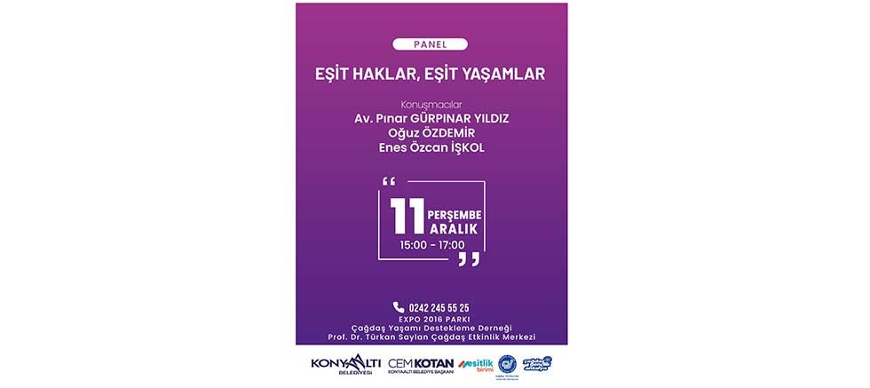 Konyaaltı Belediyesi, ‘Eşit Haklar, Eşit Yaşamlar’ konulu paneli 11 Aralık Perşembe günü EXPO Parkı’nda Çağdaş Yaşamı Destekleme Derneği iş birliğiyle gerçekleştirecek