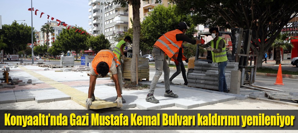 Antalya Büyükşehir Belediyesi Konyaaltı ilçesi Gazi Mustafa Kemal Bulvarı kaldırımını kent estetiğine uygun mineral taşlarla yeniliyor.