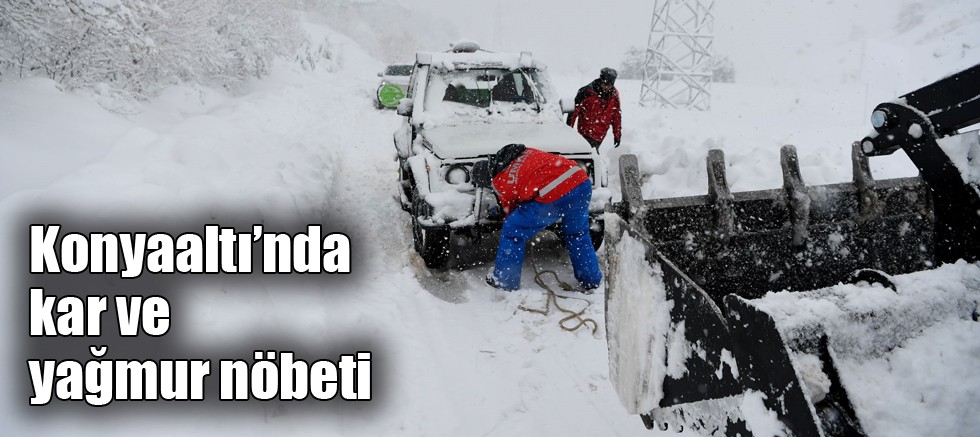 Meteorolojinin Antalya için yaptığı yağış ve fırtına uyarısından sonra önceki gün başlayan yağmur ve kar yağışı etkisini sürdürüyor. Yapılan uyarının ardından Konyaaltı Belediyesi ekipleri teyakkuz haline geçti. Kurulan acil müdahale ekipleri hem kent merkezinde hem de kırsal bölgede yaşanan olumsuzluklara anında müdahale etmeye başladı. İlçe merkezinde yaşanan sağanak yağmurun olumsuz etkileri için gece saatlerinden bu yana dönüşümlü çalışan ekipler, bir yandan da kırsal mahallelerde kar yağışı nedeniyle kapanan yolları açma çalışmalarına başladı. Saklıkent ve Feslikan Yaylası yollarında çalışmalarına aralıksız devam eden Konyaaltı Belediyesi ekipleri, aracı yolda kalan vatandaşlara da yardım etti.