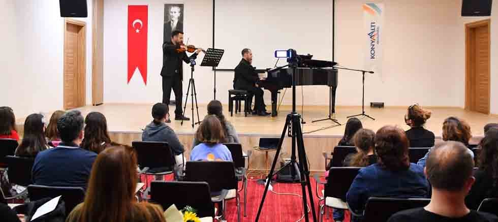Konyaaltı Belediyesi tarafından düzenlenen bir diğer etkinlik ise keman ve piyano konseri oldu. Konyaaltı Belediyesi Müzik Akademisi’nin öncülüğünde düzenlenen konsere vatandaşlar yoğun ilgi gösterdi. Konserin yapıldığı salon tamamen dolarken, belediyenin müzik akademisinde eğitim gören öğrencilerin aileleri dışarıda kaldı. Özellikle son 2 yılın sağlık ve ekonomik sorunlar nedeni ile zorlu geçtiğini ifade eden Konyaaltı Belediye Başkanı Semih Esen, “Vatandaşlarımızın, bütün bu olumsuzlukları bir nebze de olsa unutması ve keyifli vakit geçirmesi için bu tarz etkinlikler düzenliyoruz. Yurttaşlarımızın yanındayız ve onlara hizmet etmenin mutluluğunu yaşıyoruz” şeklinde konuştu.