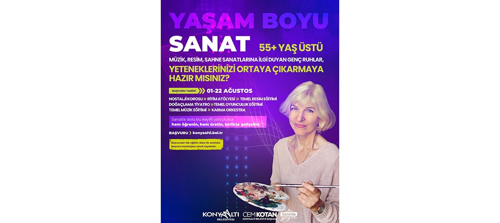 Konyaaltı Belediyesi, her yaştan sanatseveri gerek düzenlediği etkinliklerle gerekse de kurslarla buluşturmaya devam ediyor. Kurslar kapsamında yeni bir adım atan Konyaaltı, elli beş yaş üstü sanatseverler için ‘Yaşam Boyu Sanat Kursları’ düzenleyecek. Yapılan duyuruya göre kurslarda; Nostalji Korosu, Ritim Atölyesi, Temel Resim Eğitimi, Doğaçlama Tiyatro, Temel Oyunculuk Eğitimi, Temel Müzik Eğitimi, Karma Orkestra alanlarının yer alacağı belirtildi. Müzik, resim ve sahne sanatlarına ilgi duyan ve yeteneklerini ortaya çıkarmak isteyen herkesin davet edildiği kursların başvuruları, 1-22 Ağustos tarihleri arasında yapılacak. Başvurular, www.konyaalti.bel.tr internet adresinden gerçekleşecek. Öte yandan, başvuru yapmak isteyen sanatseverlerin tek eğitim alanını seçebileceği ve başvuruların kontenjanla sınırlı olduğu da aktarıldı. Gerçekleştirilecek kurslarla beraber, elli beş yaş üstü vatandaşların sanatla dolu keyifli bir yolculuk yapması amaçlanıyor.