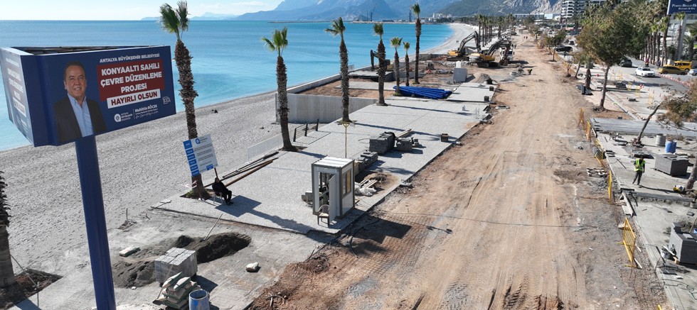 Antalya Büyükşehir Belediyesi’nin Konyaaltı Sahili’nde başlattığı çevre düzenleme projesinde hummalı çalışma sürüyor. 23 bin metrekaresi yeşil alan olmak üzere yaklaşık 74 bin metrekarelik bir alanı kapsayan projede yüzde 60 seviyesi geçildi.