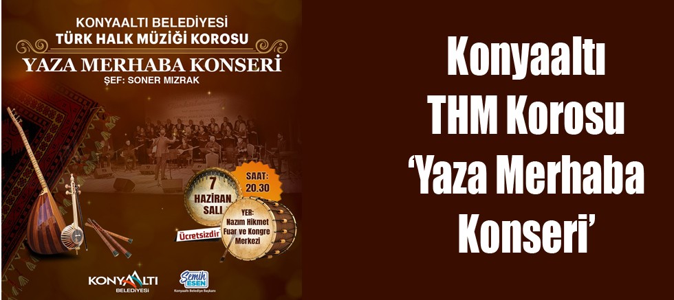 Türk Halk Müziği’ni yaşatmak, sahip çıkmak ve icra etmek amacıyla Konyaaltı Belediyesi bünyesinde kurulan Türk Halk Müziği Korosu ‘Yaza Merhaba Konseri’ ile türkü severlerle buluşacak. Koro, 7 Haziran Salı günü saat 20.30’da Nazım Hikmet Fuar ve Kongre Merkezinde sahnede olacak. Şef Soner Mızrak yönetimindeki Konyaaltı Belediyesi Türk Halk Müziği Korosu konserde solo ve koro eserler seslendirecek. Türk Halk Müziği’nin sevilen eserlerinin yer alacağı konserin ücretsiz olduğu ve Türk Halk müziği seven herkesin davet edildiği belirtildi.
