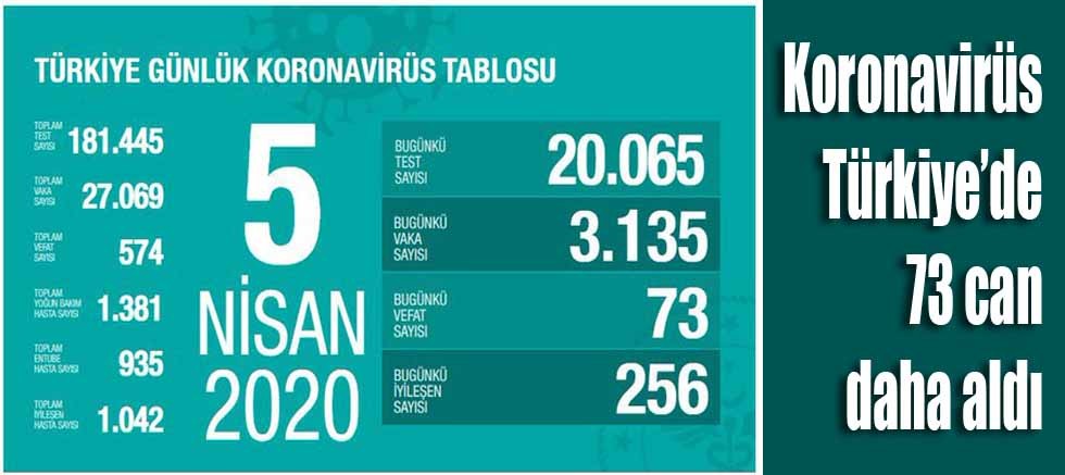 Sağlık Bakanlığı, Türkiye’deki koronavirüs vakalarına ilişkin son verileri açıkladı. 5 Nisan günü 20 bin 65 test yapıldı, 3 bin 135 yeni vaka tespit edildi, 73 kişi hayatını kaybetti ve 256 kişi iyileşti. Toplamda 181 bin 445 test yapıldı, 27 bin 69 vaka tespit edildi, 574 kişi hayatını kaybetti ve bin 42 kişi iyileşerek koronavirüsü yendi.