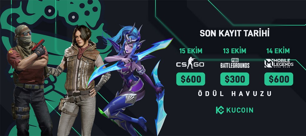 Global kripto para borsası KuCoin espor faaliyetlerine devam ediyor. Ağustos ayında ilk turnuvasını düzenleyen borsa, Ekim ayında da kaldığı yerden devam ediyor. CS:GO, PUBG: BATTLEGROUNDS ve Mobile Legends: Bang Bang olmak üzere 3 farklı oyunun olduğu yeni turnuvada kayıtlar için son başvuru tarihi 13 Ekim 2022.