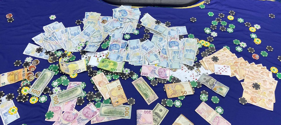 Muratpaşa ilçesi Fener ve Çağlayan Mahallelerinde ruhsatsız olarak faaliyet gösteren iş yerlerine yapılan operasyonlarda; (104) adet iskambil kağıdı, (338) adet para yerine kullanılan poker pulu, 50.050 TL, 750 Dolar ve 500 Euro toplamda 67.885 TL paraya el konulmuştur.