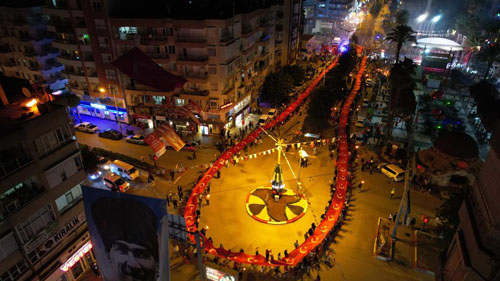 200 metre bayrak, meşaleler ve ellerindeki bayraklar eşliğinde ilçe merkezine yürüdü. Fener Alayı yürüyüşüne, Belediye Başkanı Mustafa Köleoğlu ve eşi Nurgül Köleoğlu, CHP İlçe Başkanı Arif Kocacık, İYİ Parti İlçe Başkanı Bekir Bircan, Belediye Meclis Üyeleri, muhtarlar ve çok sayıda halk topluluğu katıldı.