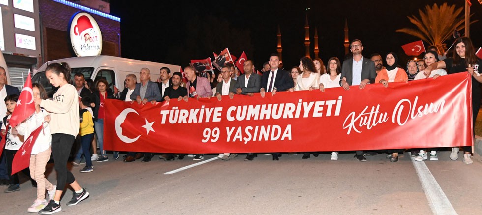Kortejin önünde ‘Türkiye Cumhuriyeti 99 Yaşında Kutlu Olsun’ yazılı pankart taşınırken, ellerinde bayrak ve meşalelerle yürüyen vatandaşlar sloganlar atıp marşlar söyleyerek yürüdü. Kortejde yürüyenlerden bazı çocuklar ise ebeveynlerinin omuzlarında yürüyüşe katıldı. Evlerinin balkonlarından fener alayına alkış tutup eşlik eden vatandaşlarda görüldü.
