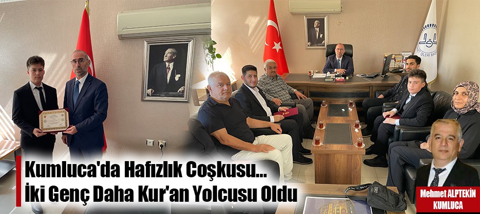 Antalya'nın Kumluca İlçesi'nde, Şirlengiç Müftü Sadık Kavalcı Yatılı Hafızlık Kur'an Kursu'nun üçüncü döneminden iki yeni hafız mezun oldu. Talha Yiğit Değirmenci ve Özcan Guran'ın hafızlık belgelerini alması, Kumluca İlçe Müftülüğü'nde düzenlenen özel bir törenle kutlandı.