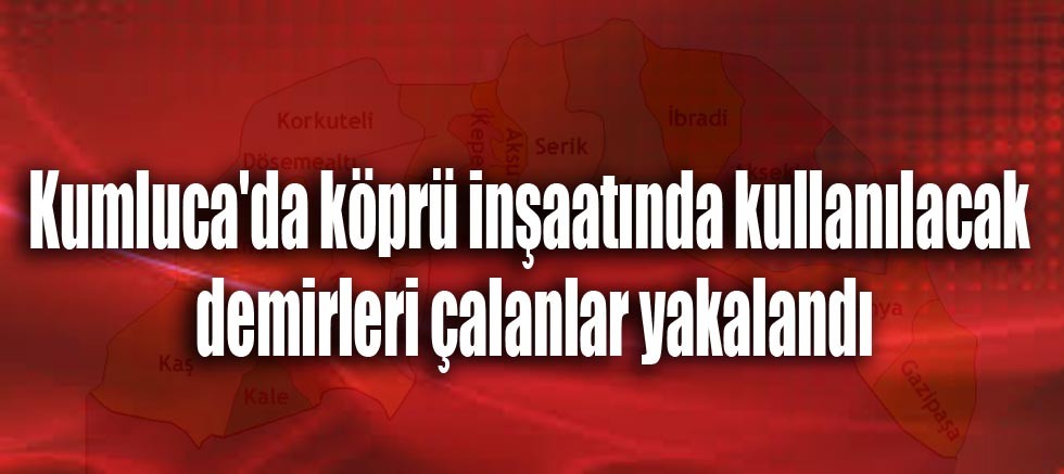 "Kumluca Cumhuriyet Başsavcılığı koordinesinde; Antalya İl Jandarma Komutanlığına bağlı Kumluca İlçe Jandarma Komutanlığı ekipleri tarafından Antalya İli, Kumluca İlçesi, Hacıveliler Mahallesinde köprü inşaatında kullanılacak demir malzemelerin çalınması olayı ile ilgili yapılan detaylı araştırmada şüpheli A.İ.U. , D.Y. ve E.Ö. çalınan malzemeler ile birlikte yakalanmıştır.
