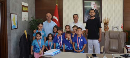 Minik Şampiyon sporcuların ziyaretinden duyduğu memnuniyeti dile getiren Kumluca Kaymakamı Uğur Kolsuz, “Kumluca olarak yüzme branşında İl Şampiyonası'nda ilk defa derece alan;