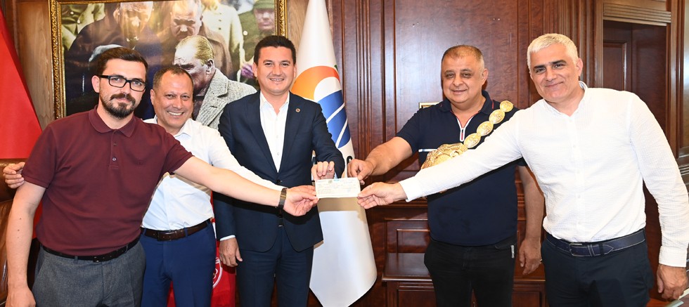 Kumluca Belediye Başkanı Mustafa Köleoğlu, çeki teslime gelen Niyazi Çiftçi ’ye ağalık Kemerini takdim etti.