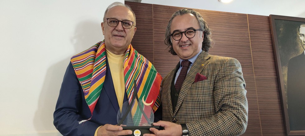Toplantı sonrası YÖRSİAD Başkanı M.Aykut Ege, konuk Dr. Ramazan Kurtoğlu’na bir teşekkür plaketi verdi ve Yörüklerin simgesi keyfiye taktı.