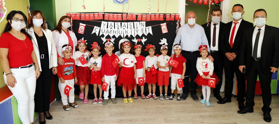 Manavgat Belediyesi Side ve Çolaklı Kreş ve Gündüz Bakımevinde eğitim-öğretim gören 120 çocuk, Cumhuriyet’in 97’nci yıldönümünü coşkuyla kutladı. Koronavirüs sebebiyle toplu etkinlik yapılmamasına özen gösteren kreş yönetimi, çocukların kendi sınıflarında kutlayabileceği ortamı günler öncesinden özenle hazırlamaya başladı. Çocuklar ve uzman eğitmen kadrosu, her sınıfta kendilerinin hazırladığı bayraklı süslemeler ve Mustafa Kemal Atatürk’ün resimleri ile kutlamayı gerçekleştirdi. Şiirler, marşlar ve şarkılar ve sınıf süslemeleri ile Atatürk’ün kurduğu Cumhuriyeti kutlayan çocukların coşkusu gözlerinden okundu. Cumhuriyet Bayramı kutlamalarına Manavgat Belediye Başkanı Şükrü Sözen’i temsilen katılan başkan yardımcısı Mustafa Ceylan, sınıfları tek tek gezdi Başkan Şükrü Sözen’in çocuklara hediye ettiği çikolataları dağıttı.