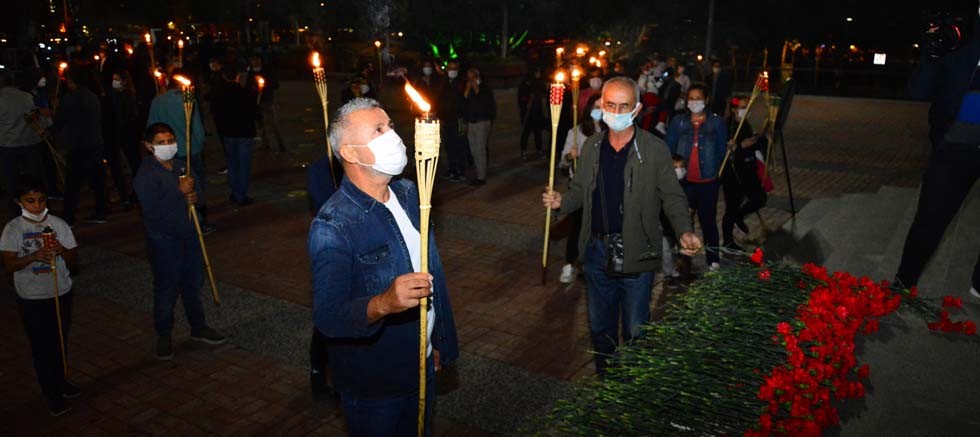 Manavgat halkı, dün akşam Cumhuriyet Meydanı’ndaki Atatürk Anıtı önünde ellerinde meşalelerle Ata’sını andı. Vatandaşlar, alana yerleştirilen 420 adet 1.5 metrelik sosyal mesafe etiketinin üzerine geçerek saygı duruşunda bulunduktan sonra Atatürk Anıtı’na 2 bin karanfil bıraktı. Meşaleli anma programı güzel ve anlamlı görüntülere sahne oldu.