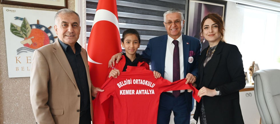 Okul Sporları Masa Tenisi Yıldız Kızlar İl Şampiyonası'na katılan Beldibi Ortaokul öğrencileri Damla Dinç, Aleyna Aslanoğlu ve Gülçiçek Selim, okul müdürü Erol Öztürk, Masa tenisi hocası Şule Yüksel ile Kemer Belediye Başkanı Necati Topaloğlu'nu makamında ziyaret etti.