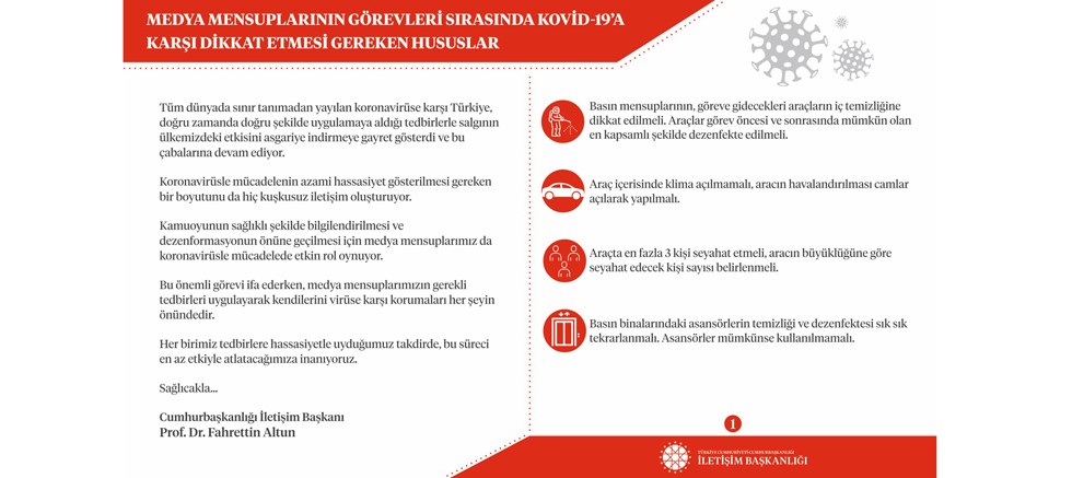 İletişim Başkanlığı tarafından hazırlanan “Medya Mensuplarının Görevleri Sırasında Kovid-19’a Karşı Dikkat Etmesi Gereken Hususlar” başlıklı rehberde şunlar kaydedildi: