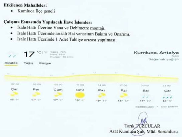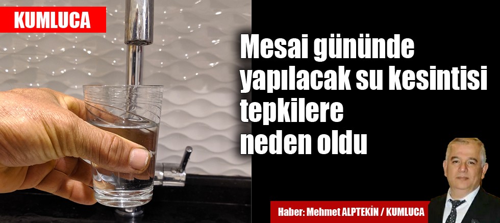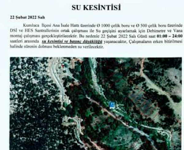 Kumluca'da, ilk etapta 15 Şubat Salı günü yapılması planlanan su kesintisi, önce haftasonu yapılacak denilerek ertelenmişti. Daha sonra tekrar 22 Şubat Salı günü yapılacağı açıklanan kesinti, vatandaşlar tarafından tepkiyle karşılandı.