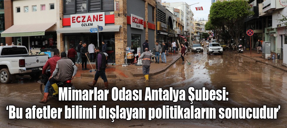 Antalya’nın Kumluca ve Finike ilçelerinde yaşanan sel felaketiyle ilgili açıklama yapan Mimarlar Odası Antalya Şubesi, “Doğal olay olan sağanak yağmurun ve diğer doğa olaylarının afete dönüşmesi, bilimi dışlayan politikalar sonucu ödenen bedeldir” dedi.