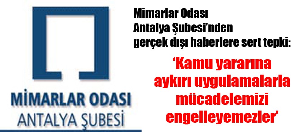 Bu yaşanan gelişmelerin, rant beklentisi içerisinde olan çevrelerin baskı, şantaj ve tehditlerinin bir yansıması olduğuna işaret edilen Mimarlar Odası Antalya Şubesi’nin açıklamasında, bu tür girişimlere karşı kararlılıkla mücadele edileceği belirtilerek, şöyle denildi: “Mimarlar Odası, rant beklentisi içerisinde olan çevrelerin tüm baskı ve tehditlerine karşın bakanlıklar ve belediyelerin mevzuata ve kamu yararına aykırı uygulamalarına karşı hukuk mücadelesi vermektedir. Bu çevrelerin Mimarlar Odası’nın bu duruşundan rahatsız oldukları açıktır. Bu çevrelerin gerçek dışı haberlerle Mimarlar Odası Başkanı Hasan Çerçiler’i ve Mimarlar Odası’nı itibarsızlaştırılmaya yönelik bu ve benzeri girişimleri, Hasan Çerçiler’i ve Mimarlar Odası’nı bu mücadelesinden vazgeçiremeyeceklerdir. Gerçek dışı haberlerle Mimarlar Odası Başkanı Hasan Çerçiler'i ve Mimarlar Odası’nın kamu yararına aykırı uygulamalarla mücadelesini engelleyemezler, yıldıramazlar. Kamuoyunun bilgisine saygılarımızla sunarız.”