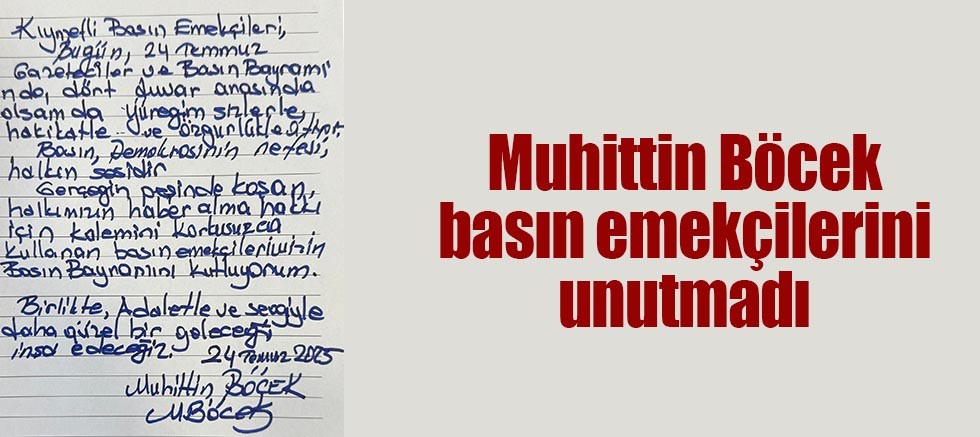 Basın üzerindeki sansürün kaldırılışının 117. yıldönümünde basın emekçilerini unutmayan Muhittin Böcek, 24 Temmuz Gazeteciler ve Basın Bayramı’nı gönderdiği mesajla kutladı. Böcek, kaleme aldığı mesajında şu ifadelere yer verdi: “Kıymetli Basın Emekçileri, Bugün, 24 Temmuz Gazeteciler ve Basın Bayramı’nda, dört duvar arasında olsam da yüreğim sizlerle, hakikatle ve özgürlükle atıyor. Basın, demokrasinin nefesi, halkın sesidir. Gerçeğin peşinde koşan, halkımızın haber alma hakkı için kalemini korkusuzca kullanan basın emekçilerimizin Basın Bayramı’nı kutluyorum. Birlikte, adaletle ve sevgiyle daha güzel bir geleceği inşa edeceğiz.”