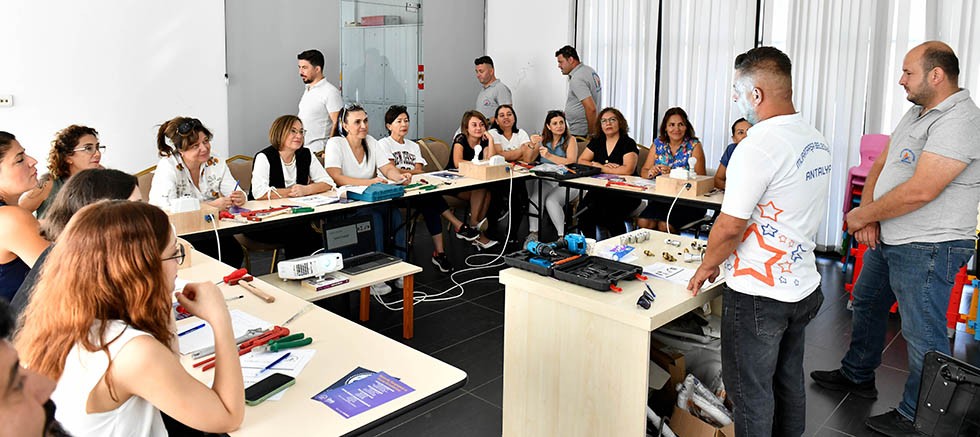 Belediyenin Kadın Aile Müdürlüğü tarafından gerçekleştirilen etkinlikte Fen İşleri Müdürlüğü ustaları eğitim verdi. Elektrik, sıhhi tesisat ve mobilya olmak üzere üç bölümden oluşan eğitim pense, tornavida, kontrol kalemi, yan keski, ingiliz anahtarı gibi el aletlerinin tanıtılmasıyla başladı. İş güvenliğiyle devam eden eğitimde katılımcılara kontrol kalemiyle priz kontrolü yaptırılmasının ardından prizlerin nasıl değiştirilebileceği öğretildi.