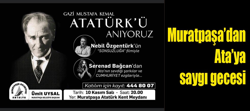 Antalya, Gazi Mustafa Kemal Atatürk’ü vefatının 82’nci yıldönümünde, Muratpaşa Belediyesi’nin düzenleyeceği etkinlikle anacak. 10 Kasım Salı günü Muratpaşa Atatürk Kent Meydanı’nda düzenlenecek anma programı, saat 20.00’de başlayacak. Gazeteci, yazar ve yönetmen Nebil Özgentürk’ün de katılımıyla bir Nebil Özgentürk çalışması olan ‘Sonsuzluğa’ film gösterimiyle başlayacak anma programı Serenad Bağcan dinletisiyle devam edecek.