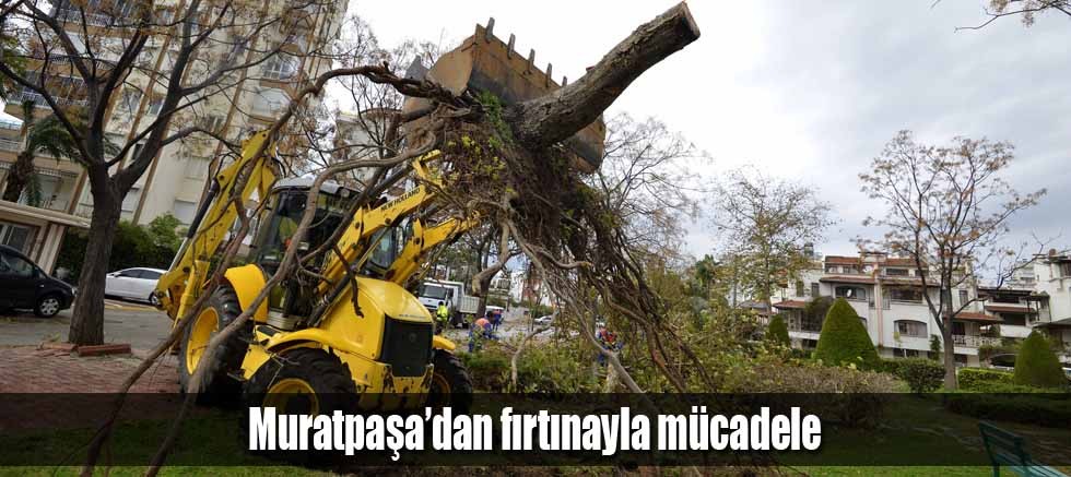 Meteoroloji 4. Bölge Müdürlüğü'nün 'turuncu’ kodla uyardığı Antalya’da gece saatlerinde başlayan fırtına günün ilk saatlerinde etkisini arttırdı. Saatteki hızı 123 kilometreye ulaşan fırtına, Muratpaşa’da da hasara neden oldu. Parklarda ağaçlar devrildi, çocuk oyun grupları ve spor aletleri zarar gördü. Dün gece saatlerinde teyakkuz durumuna geçen Muratpaşa Belediyesi Fen İşleri ve Park ve Bahçeler müdürlükleri, Turunç Masa üzerinden bildirilen olumsuzlara anında müdahale etti. Ekipler, gün içinde, fırtınanın kökünden söktüğü 170 ağacı kaldırdı.