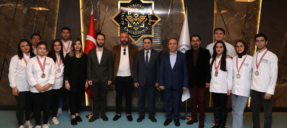 Uluslararası Gastronomi ve Mutfak Yıldızları Buluşması (GastroAntalya) yarışmasından 6 kategoride 1 altın, 2 gümüş ve 3 bronz madalya kazanarak ALKÜ’yü gururlandıran Gazipaşa Mustafa Rahmi Büyükballı Meslek Yüksekokulu Aşçılık Programı öğrencileri; ALKÜ Rektörü Prof. Dr. Kenan Ahmet Türkdoğan’ı ziyaret etti. Ziyarete Gazipaşa Mustafa Rahmi Büyükballı Meslek Yüksekokulu Müdürü Dr. Öğr. Üyesi Mehmet Kahyaoğlu ile Otel, Lokanta ve İkram Hizmetleri akademisyen ve öğrencileri katıldı.