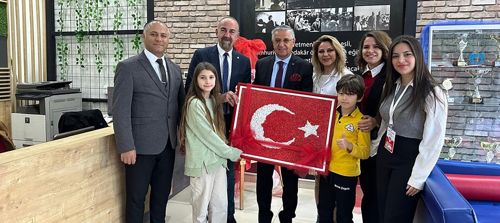 Kemer Final Okulları Resim Kulübü öğrencileri, grapon kağıtlarıyla yaptığı Türk bayrağını, Kemer Belediye Başkanı Necati Topaloğlu’na hediye etti.