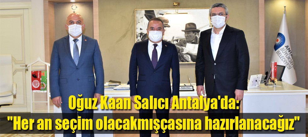 CHP’nin Örgütlerden Sorumlu Genel Başkan Yardımcısı Oğuz Kaan Salıcı, Antalya’da örgütlerle ve belediye başkanlarıyla bir araya geldi. Salıcı’ya tüm görüşmeleri esnasında eşlik eden CHP Antalya İl Başkanı Nuri Cengiz, “Her an seçim olacakmışcasına hazır bulunmak için çok daha sıkı çalışıp birlikte hareket edeceğiz” dedi