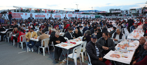 CHP lideri Özgür Özel, konuşmasının ardından Antalya Büyükşehir Belediye Başkanı ve Adayı Muhittin Böcek ile birlikte alanı dolduran Antalyalılara karanfil dağıttı. Başkan Böcek, Genel Başkan Özel’e üzerinde Özgür Özel yazılı 07 numaralı Antalyaspor forması hediye etti. CHP Genel Başkanı Özel ve Başkan Muhittin Böcek, tek tek 19 ilçe belediye başkan adayı ile birlikte halkı selamladı. Daha sonra ise CHP Genel Başkanı Özel, miting alanının yan tarafında oluşturulan alanda Antalyalı vatandaşlarla birlikte iftar yaptı. Binlerce kişinin katıldığı iftar programında Özgür Özel’e Antalya Büyükşehir Belediyesi’nin deprem bölgesinde çok güzel çalıştığını kaydetti. Özgür Özel, iftar programında vatandaşlarla birlikte sohbet ederek, Antalya programını tamamladı.